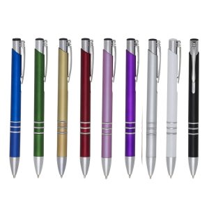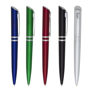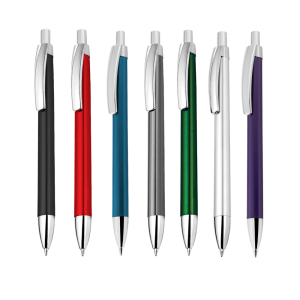 Caneta plástica com design fino, corpo colorido e detalhes em prata