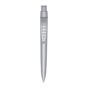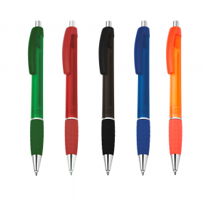 Caneta plástica inteira prata com detalhes emborrachados coloridos em relevo