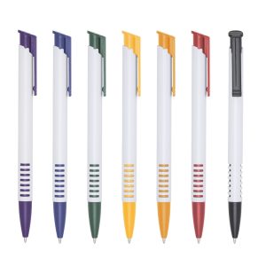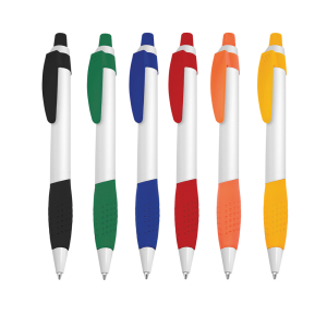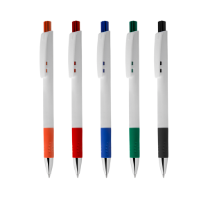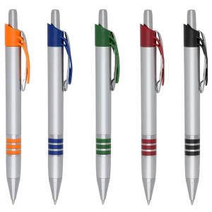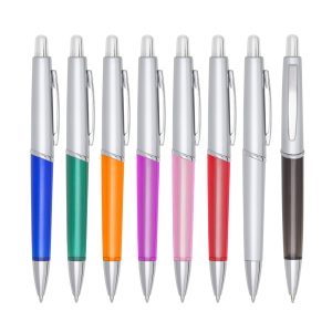 Caneta plástica inteira prata com detalhes inferiores coloridos